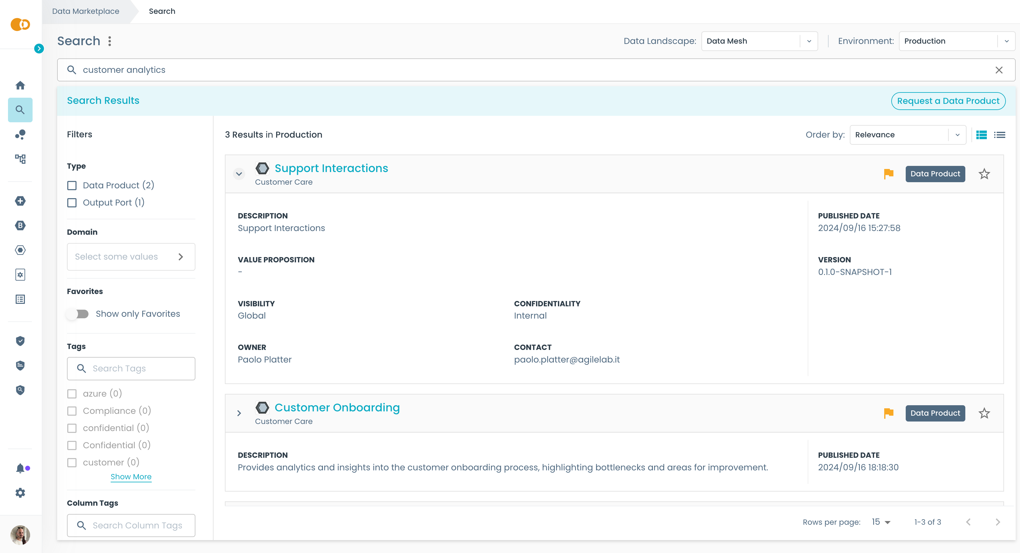 In this tutorial, you will learn how to search for and discover products in the Marketplace. We will use the Data Mesh paradigm as our example data landscape, so you will see the term data product used interchangeably with product. You will also learn how to access the Lineage Graph for a product.