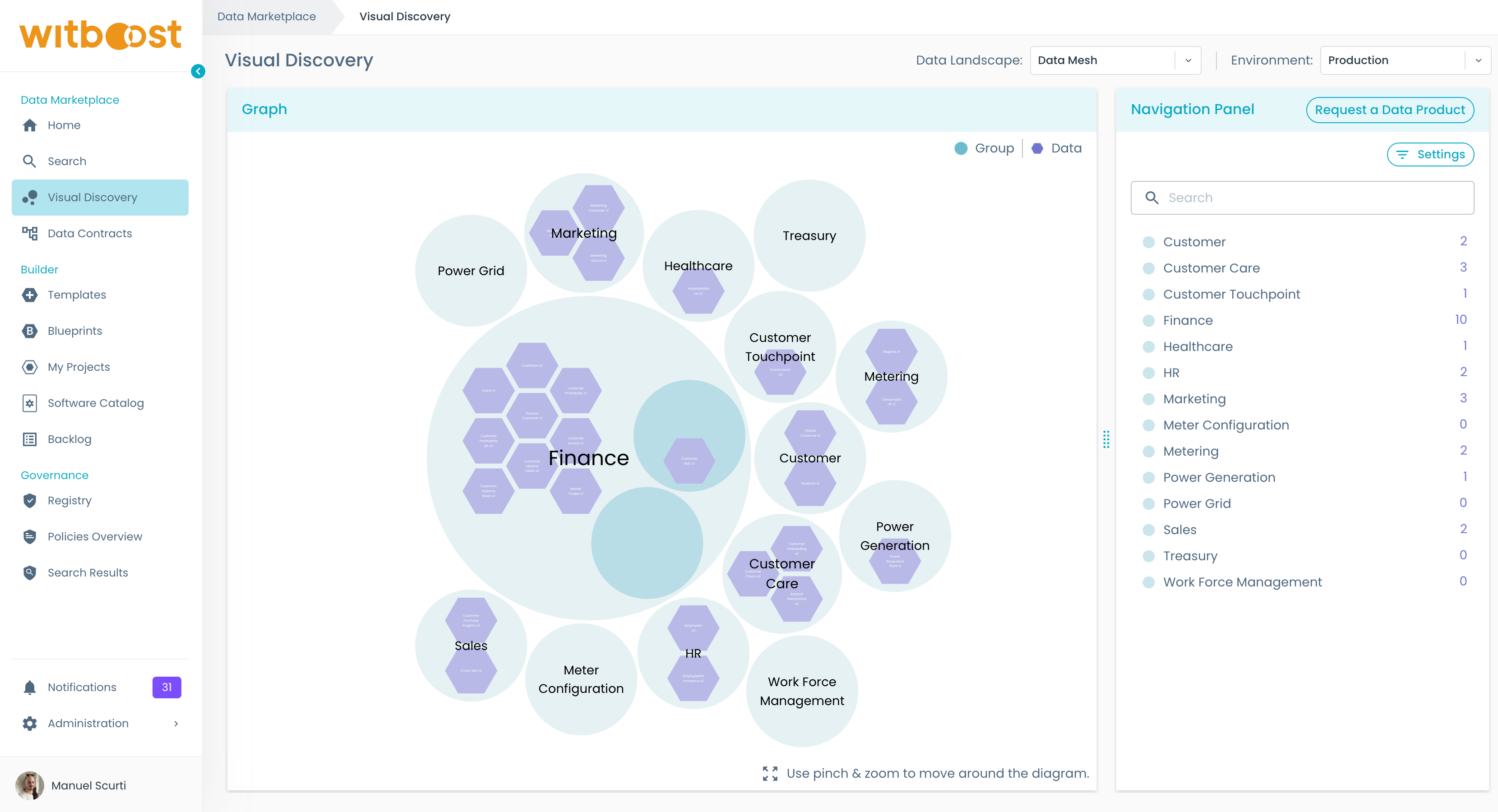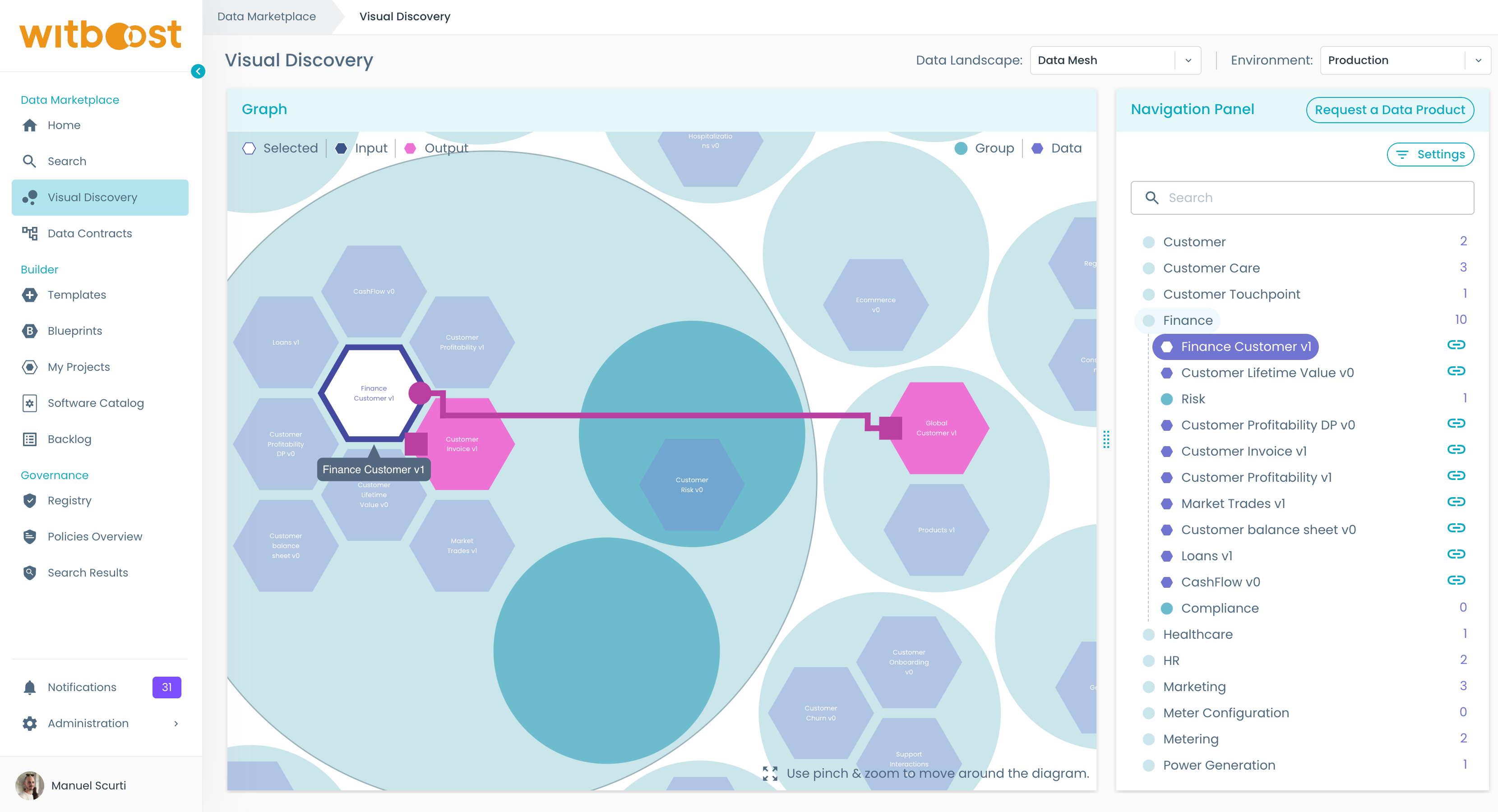 The Witboost Marketplace is a central catalog of published products that you can use to search or discover data assets that fit your business case. What ends up in the marketplace is guaranteed to be compliant to the compliance checks and quality guardrails required by the Governance team at your company.