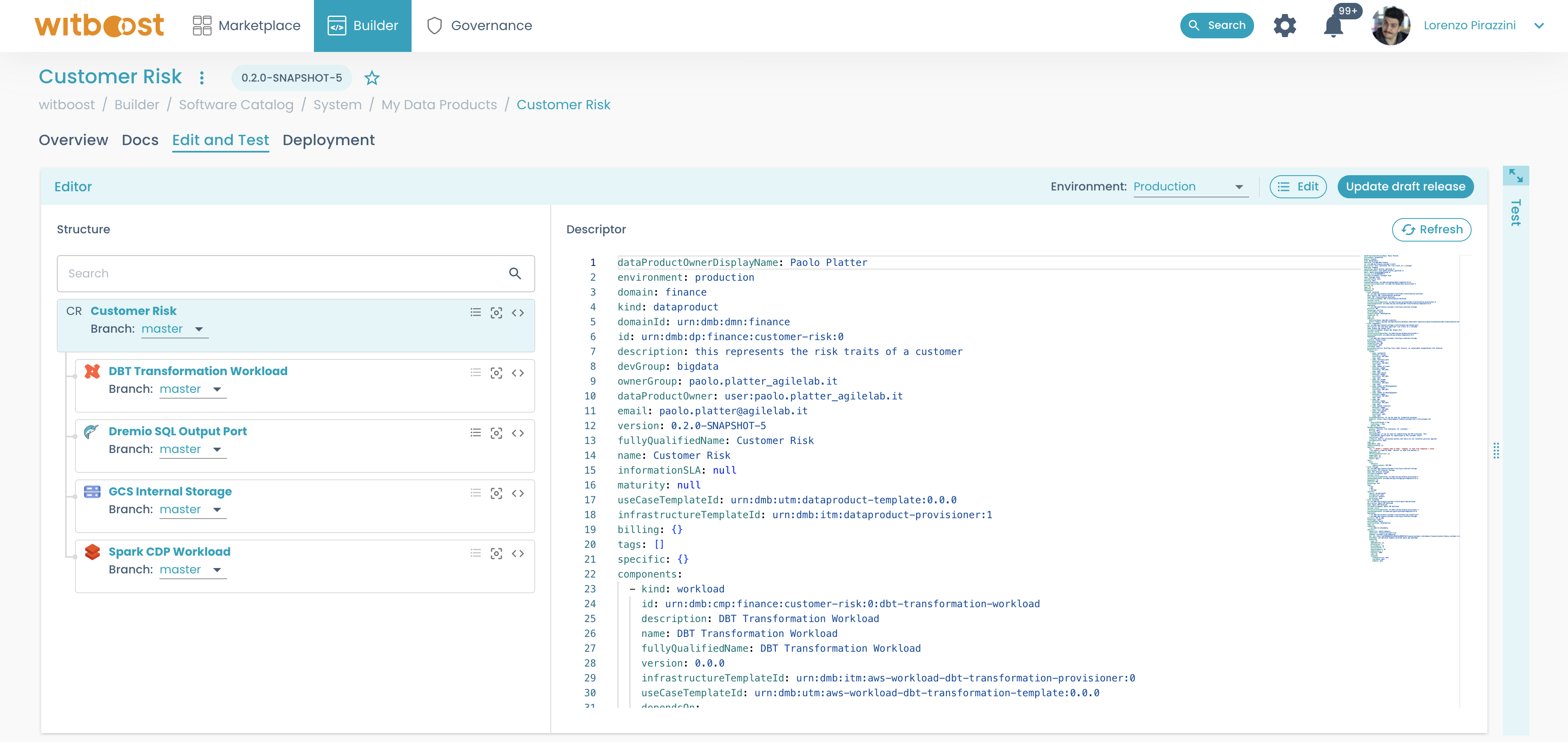 spec.meshsection should not be changed since they will affect how the entity is processed inside Witboost. From the details page of a Data Product, you will be able to access also theEdit and Testtab, where the Data Product Descriptor is automatically generated for you, to check it as a whole.